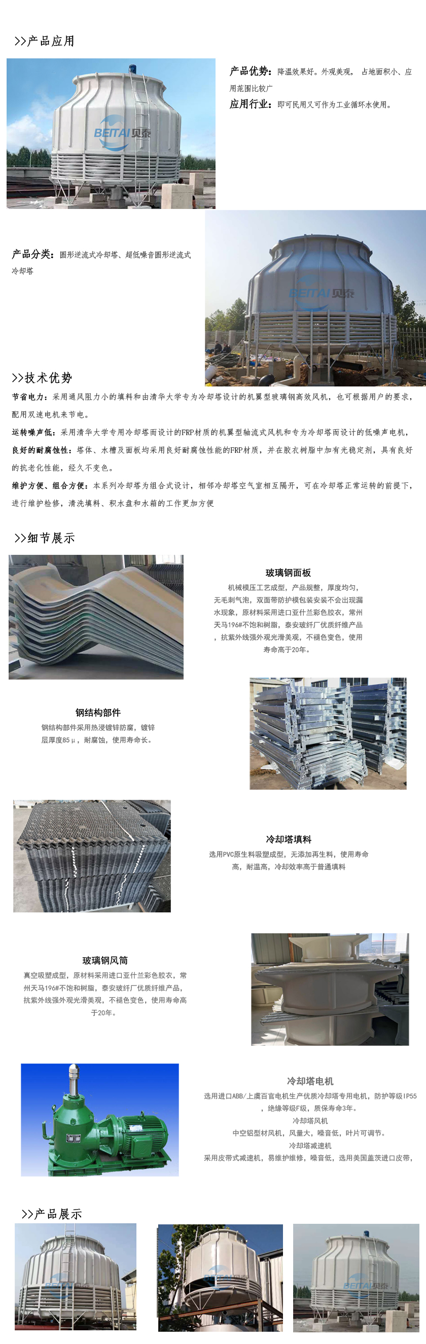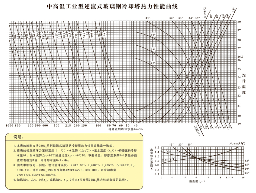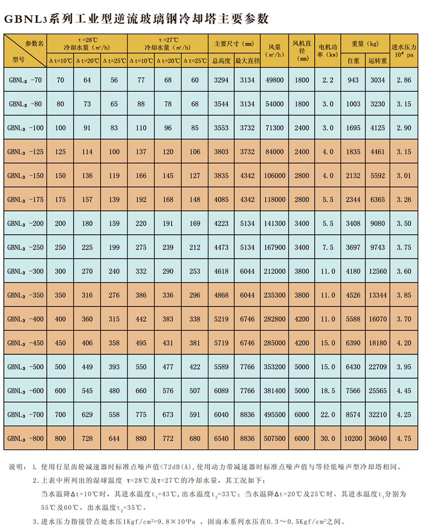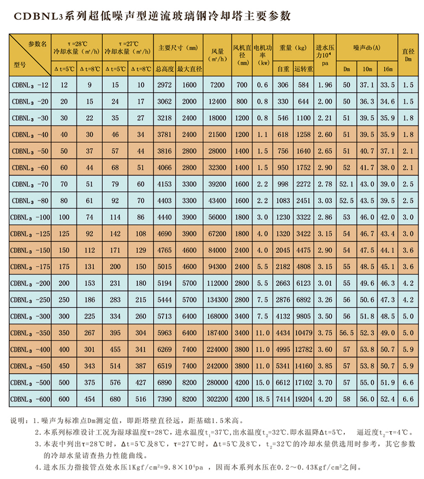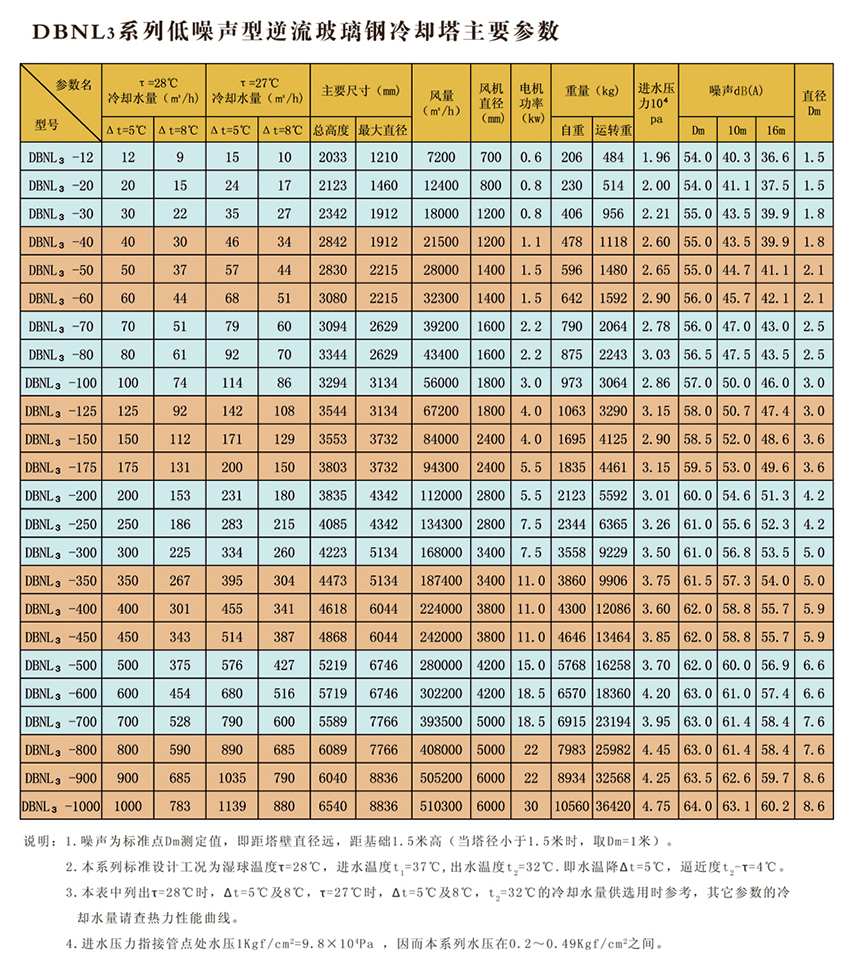 圓形逆流式玻璃鋼冷卻塔,室友機(jī)械工業(yè)部第四設(shè)計(jì)研究院在原設(shè)計(jì)的同類塔測試數(shù)據(jù)基礎(chǔ)上改進(jìn)設(shè)計(jì)的。本設(shè)計(jì)的特點(diǎn)是冷卻塔風(fēng)機(jī)配有變扭矩雙速電機(jī);當(dāng)氣溫較低時(shí),例如晚上,電機(jī)開低速,冷卻噪聲可低3-5dB(A)。此外,選用雙速電機(jī)節(jié)電顯著。多臺(tái)冷卻塔配單速電機(jī)時(shí),為了節(jié)電,當(dāng)空氣濕球溫度低時(shí),可停部分電機(jī),但仍比用雙速電機(jī)(以年計(jì))多耗電40%。